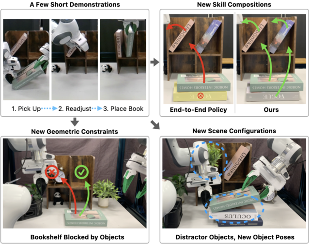 My research focuses on robot learning, with the aim of developing algorithms with scalable data sources for structural generalization (e.g., across tasks 1,2,3,4, environments 1,2,3,4, and embodiments 1,2,3). Towards this goal, I am currently interested in: