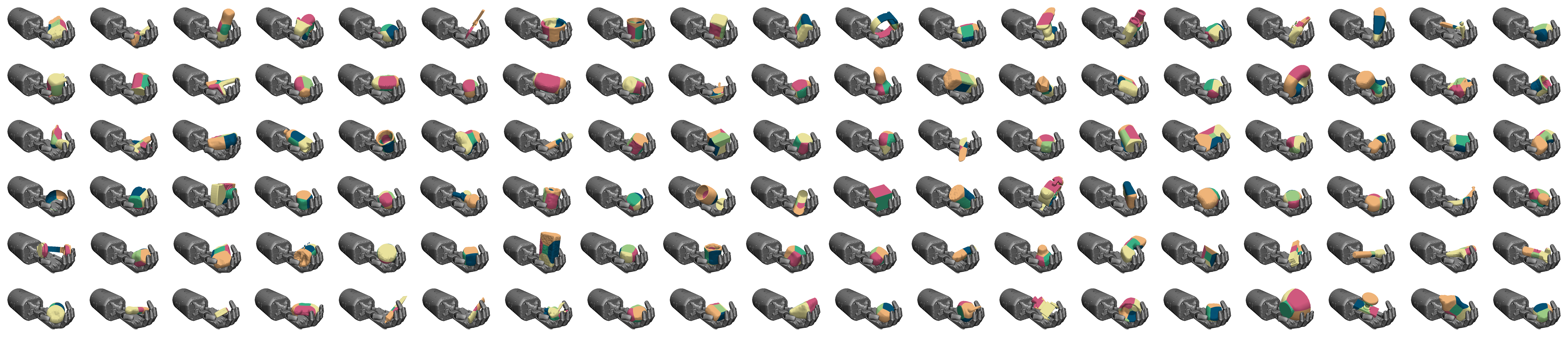 Along with the paper, we also release a suite of dexterous manipulation tasks built upon OpenAI Gym and MuJoCo. Instead of using simple-geometry objects (e.g. cube, egg, etc), the tasks feature a diverse set of 114 real-world objects collected from the YCB Dataset and the ContactDB Dataset.