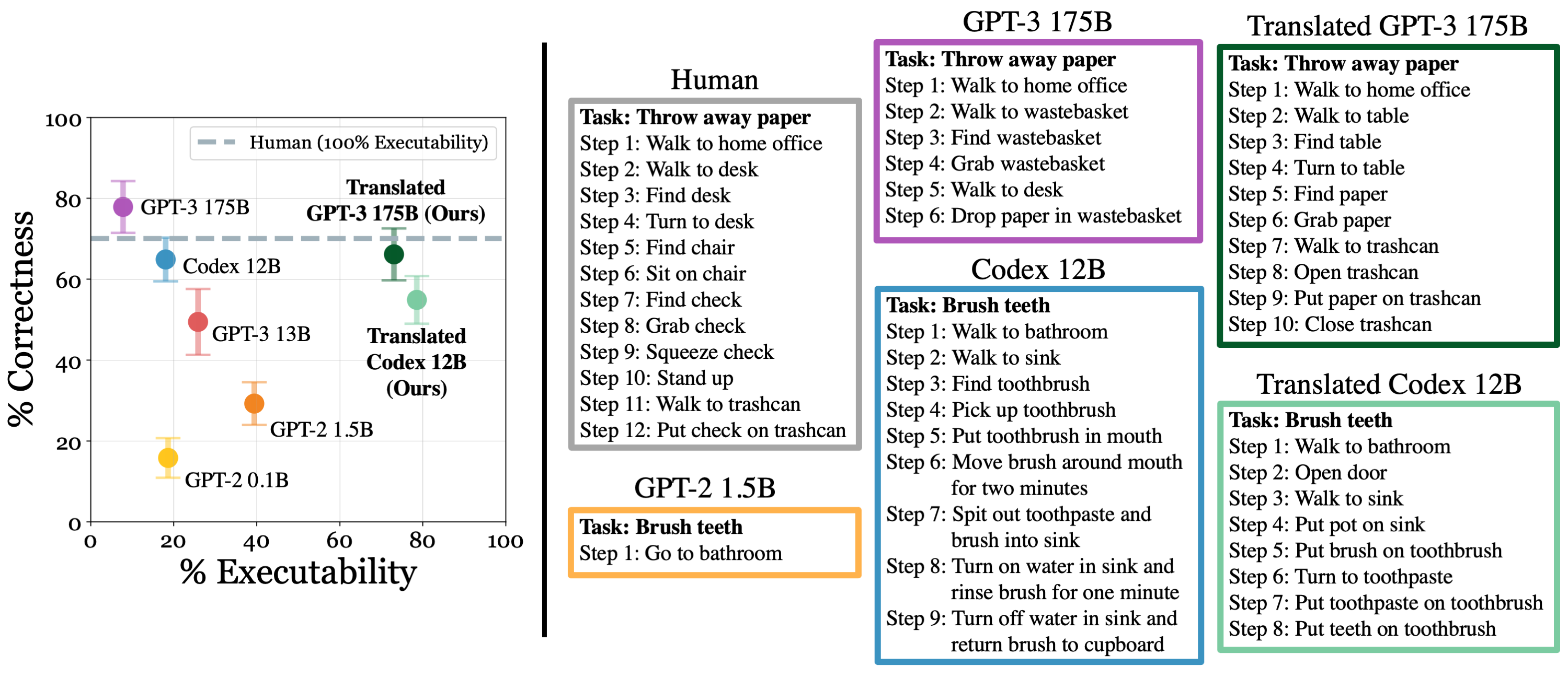 We consider two axes for evaluation: executability and correctness. Executability measures whether an action plan can be correctly parsed and satisfies the common-sense constraints of the environment. Correctness is evaluated by humans, where 10 human annotators determine the semantic correctness of the generated plans.